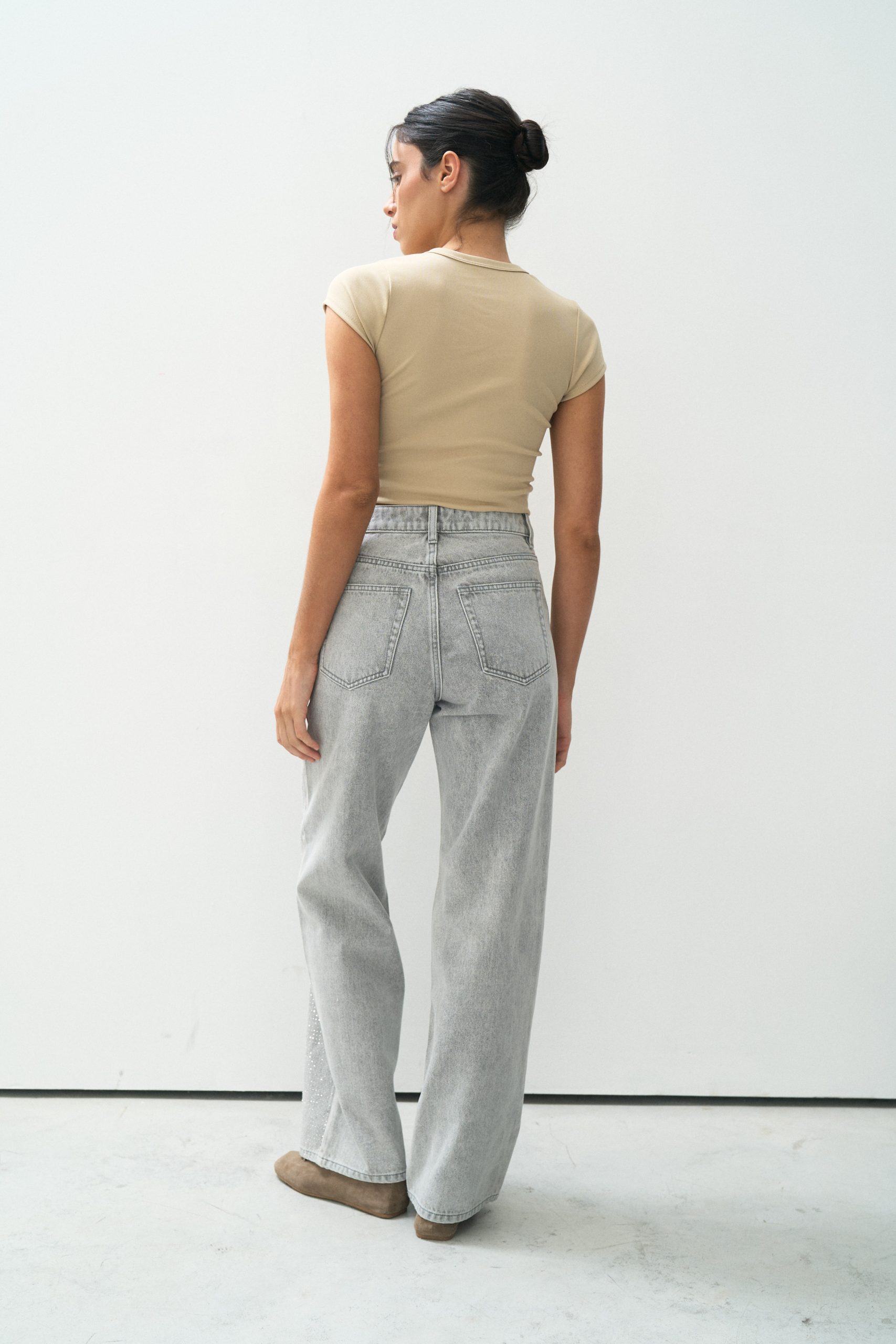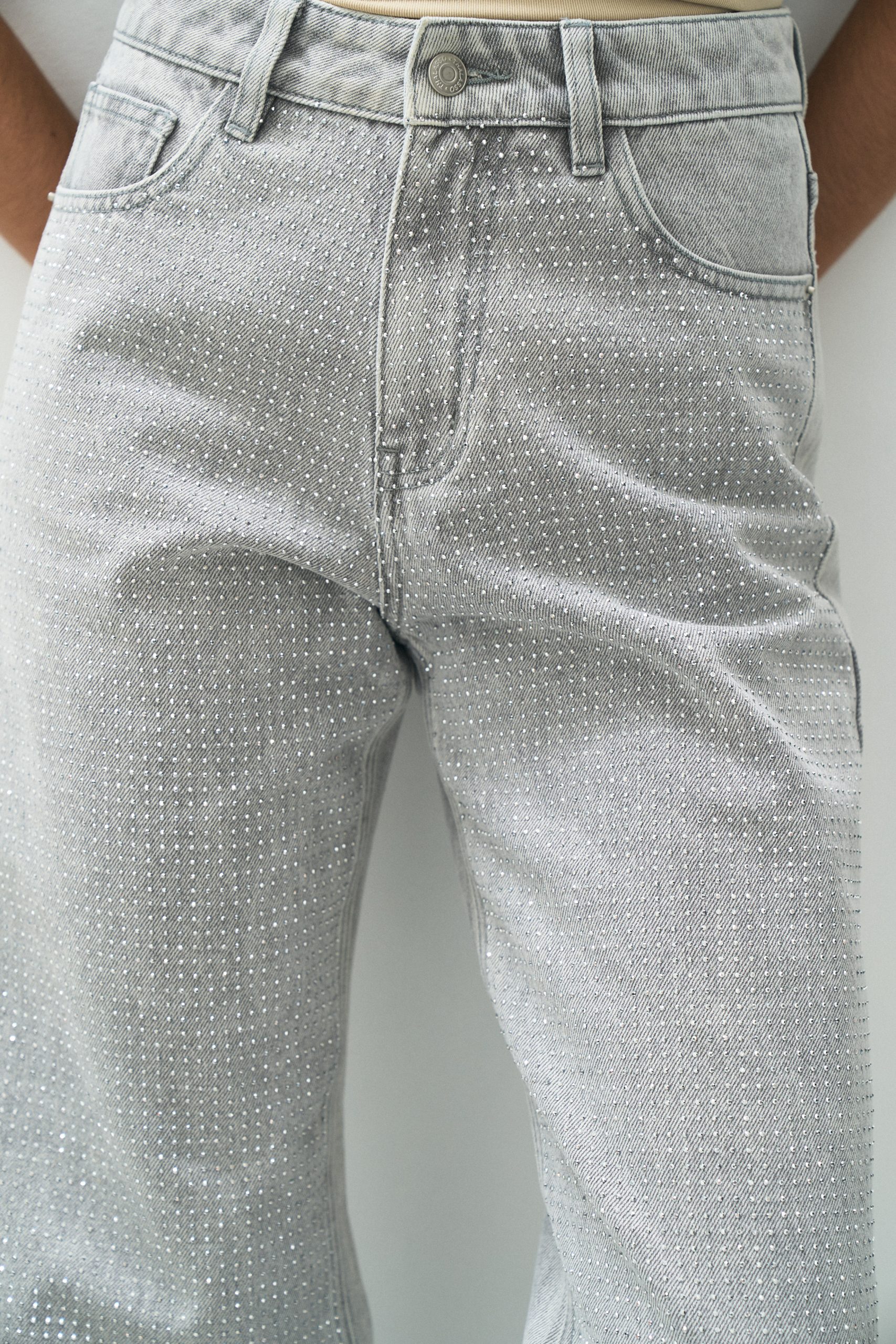 Etiquetas: full strass, gris, hilo a tono, hot fix, jean, rigido, tiro alto, wide leg